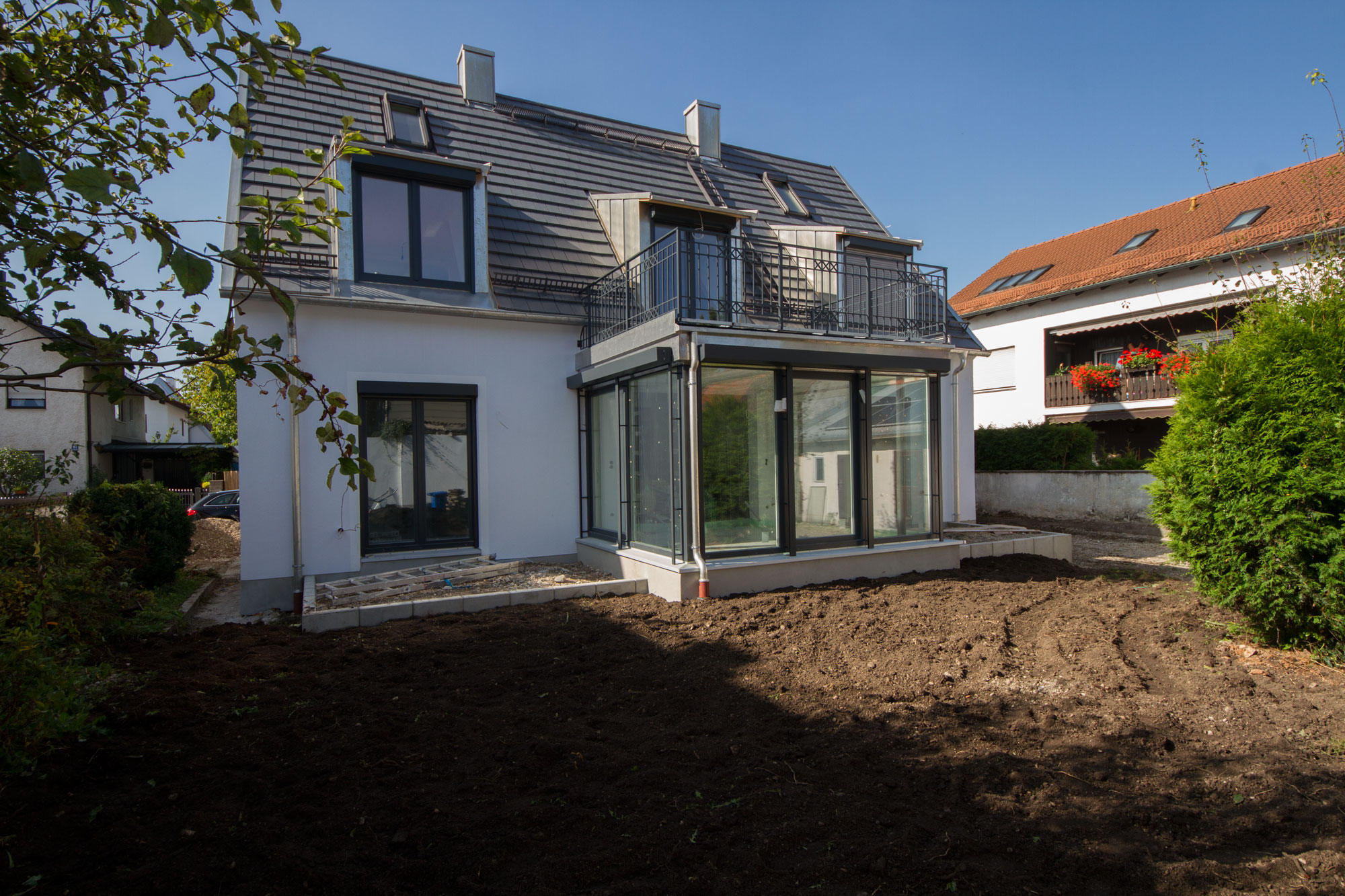 Anbau eines Wintergartens, Dachgeschoss-Ausbau, Energetische Sanierung, Innenausbau und Freiflächengestaltung