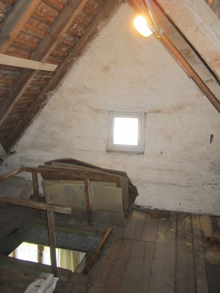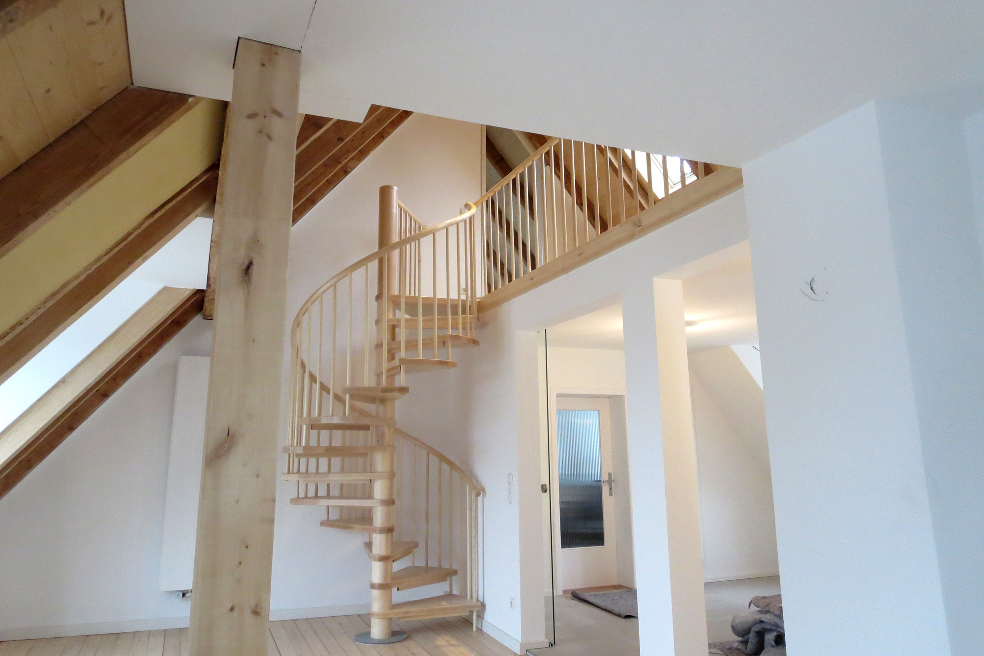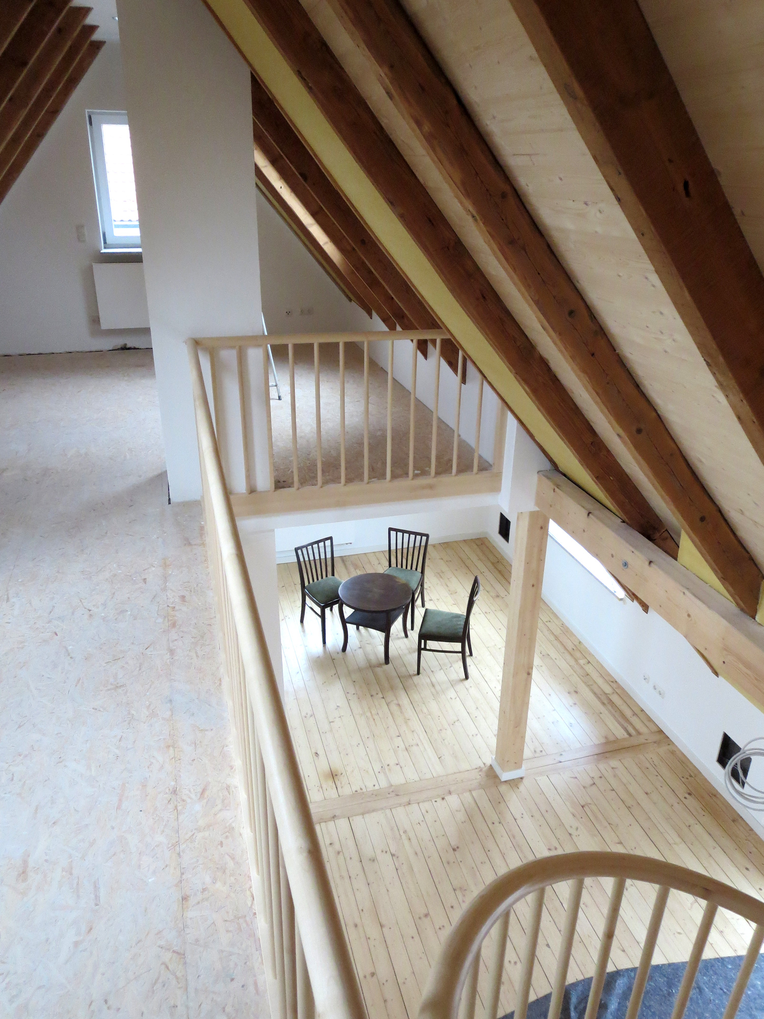 Die alte Einschubtreppe aus dem Treppenhaus in den nicht ausgebauten Dachspitz wurde entfernt, ebenso die gesamte Decke über dem bisherigen Wohnzimmer der oberen Wohnung zum Dachspitz. Dort wird eine Spindeltreppe eingebaut, die die obere Wohnung großzügig mit dem jetzt ausgebauten Galeriegeschoß verbindet.